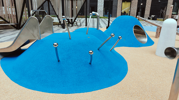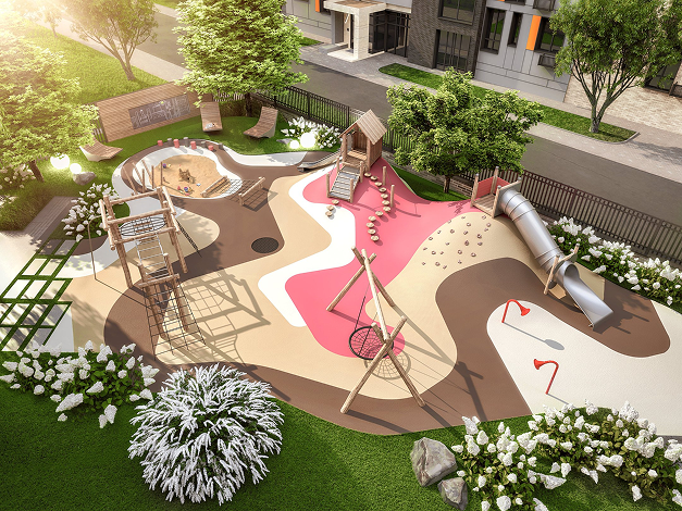 Площадки, оформленные с учётом экологии: использование натуральных материалов, создание зелёных зон с растениями и элементами, которые гармонично вписываются в окружающую природу. Например, геопластика может окружать зоны с деревьями или клумбами на детской площадке или иметь частично озеленённую поверхность.