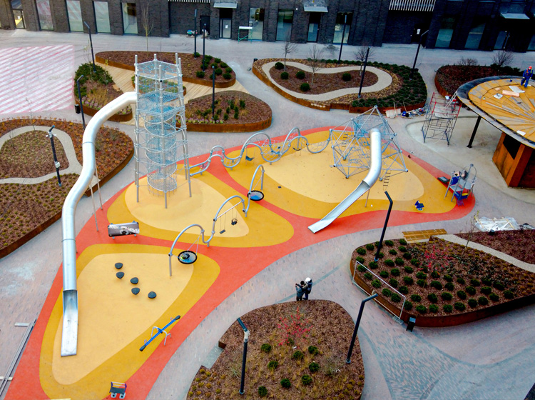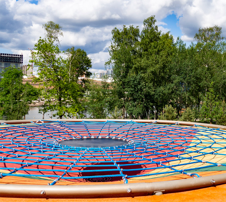 Для интеграции с ландшафтом применяем изделия из EPDM крошки, а также создаём элементы геопластики. В отсутствии естественного ландшафта, такие элементы: